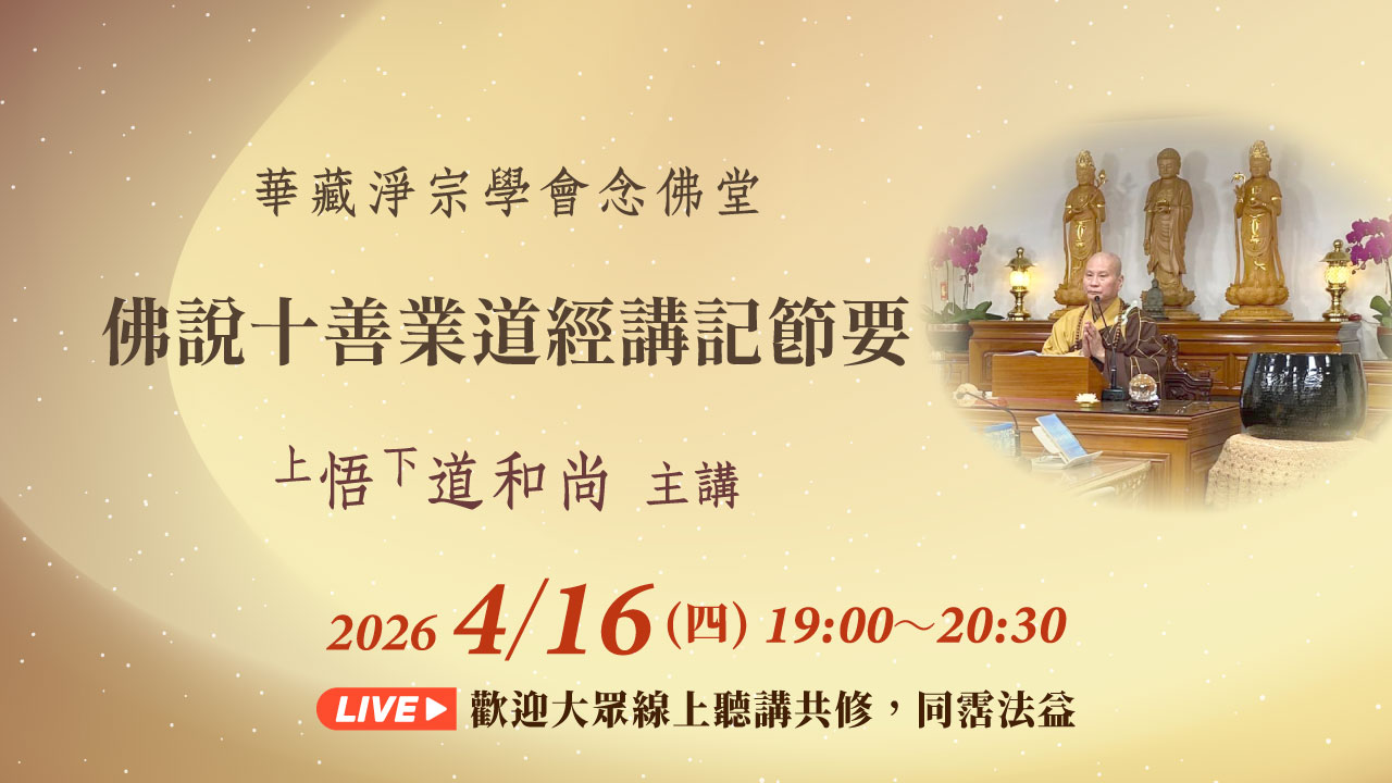 4/16(四)晚上7:00華藏念佛堂恭請悟道和尚主講《佛說十善業道經講記節要》,網路直播,歡迎大家線上聽講,同霑法益。相關資訊敬請參閱…