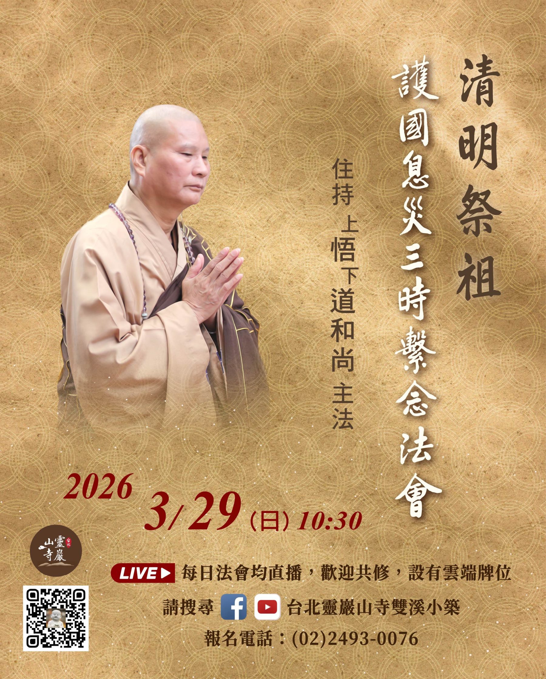 首頁 > 最新消息 > 法會講經 > 法會 > 3/29 線上直播共修|雙溪小築清明祭祖護國息災三時繫念法會